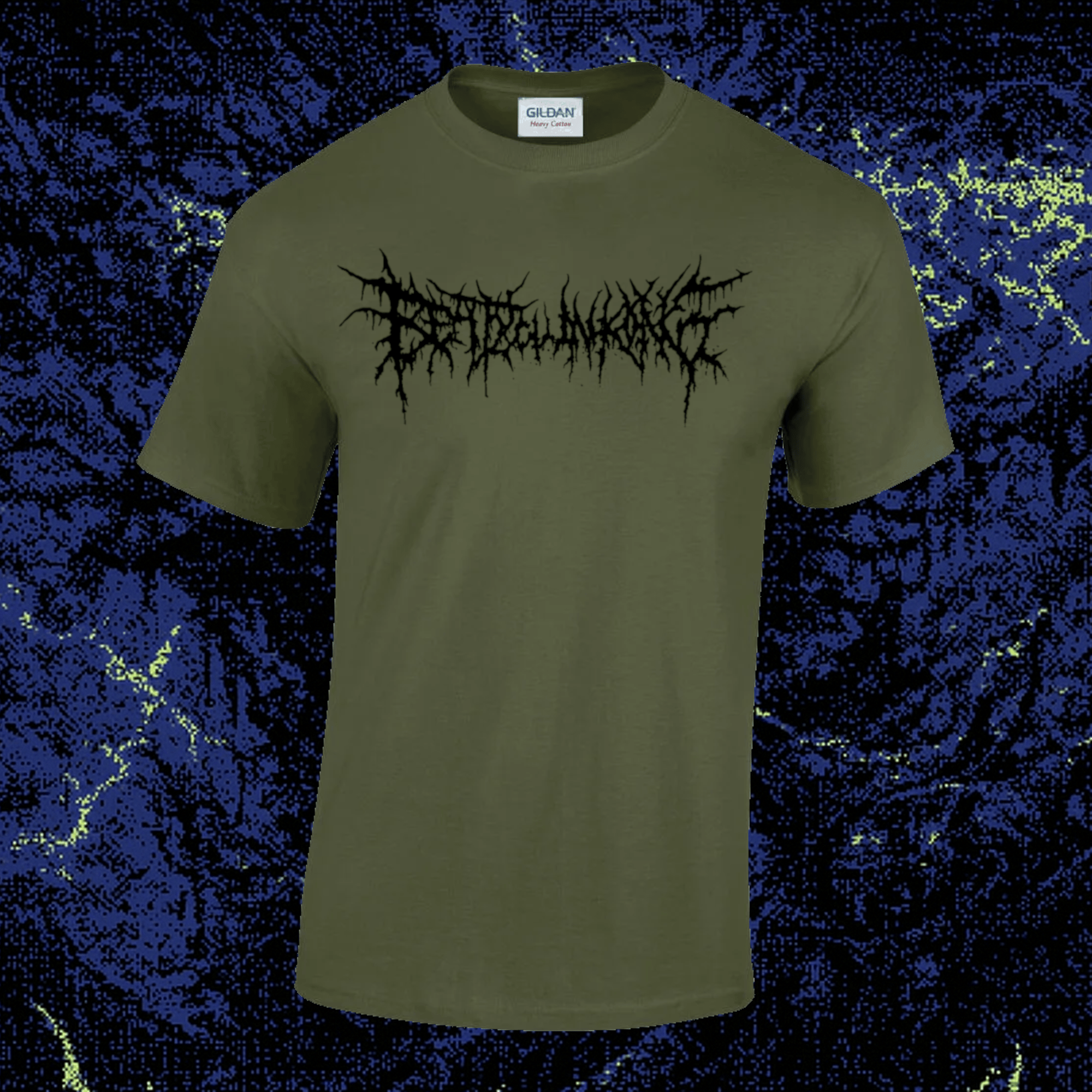 Black logo on olive coloured shirts
